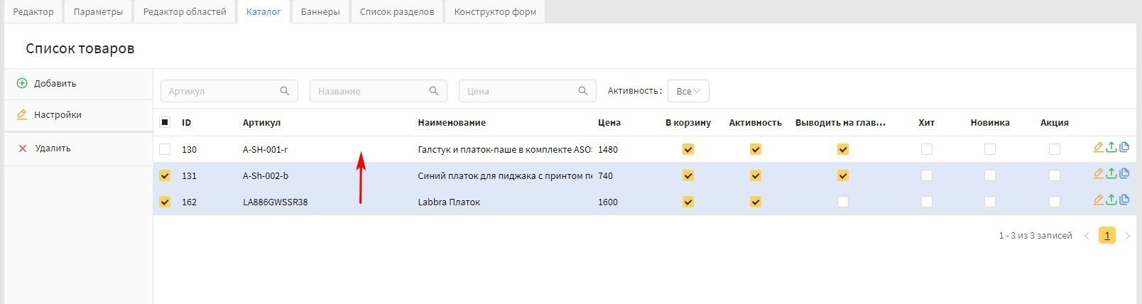В версии 22.2 Canape CMS для каталога появилась возможность производить действия с несколькими товарами. Можно делать следующее: