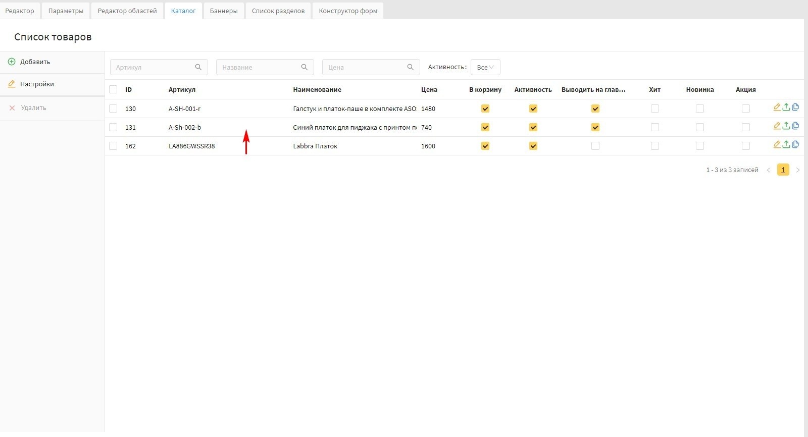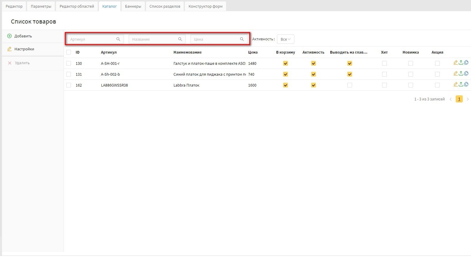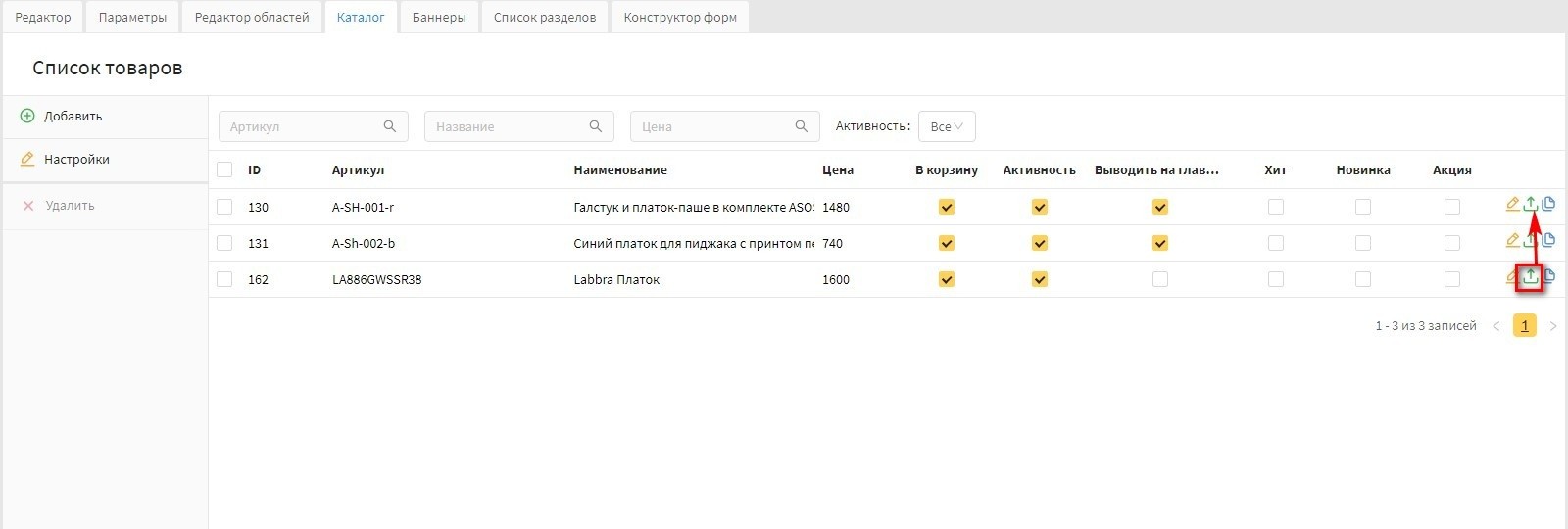 Данный функционал добавлен в версии 20.1 Canape CMS для панели "Товары" и в 22 версии Canape CMS для раздела типа "Каталог".
