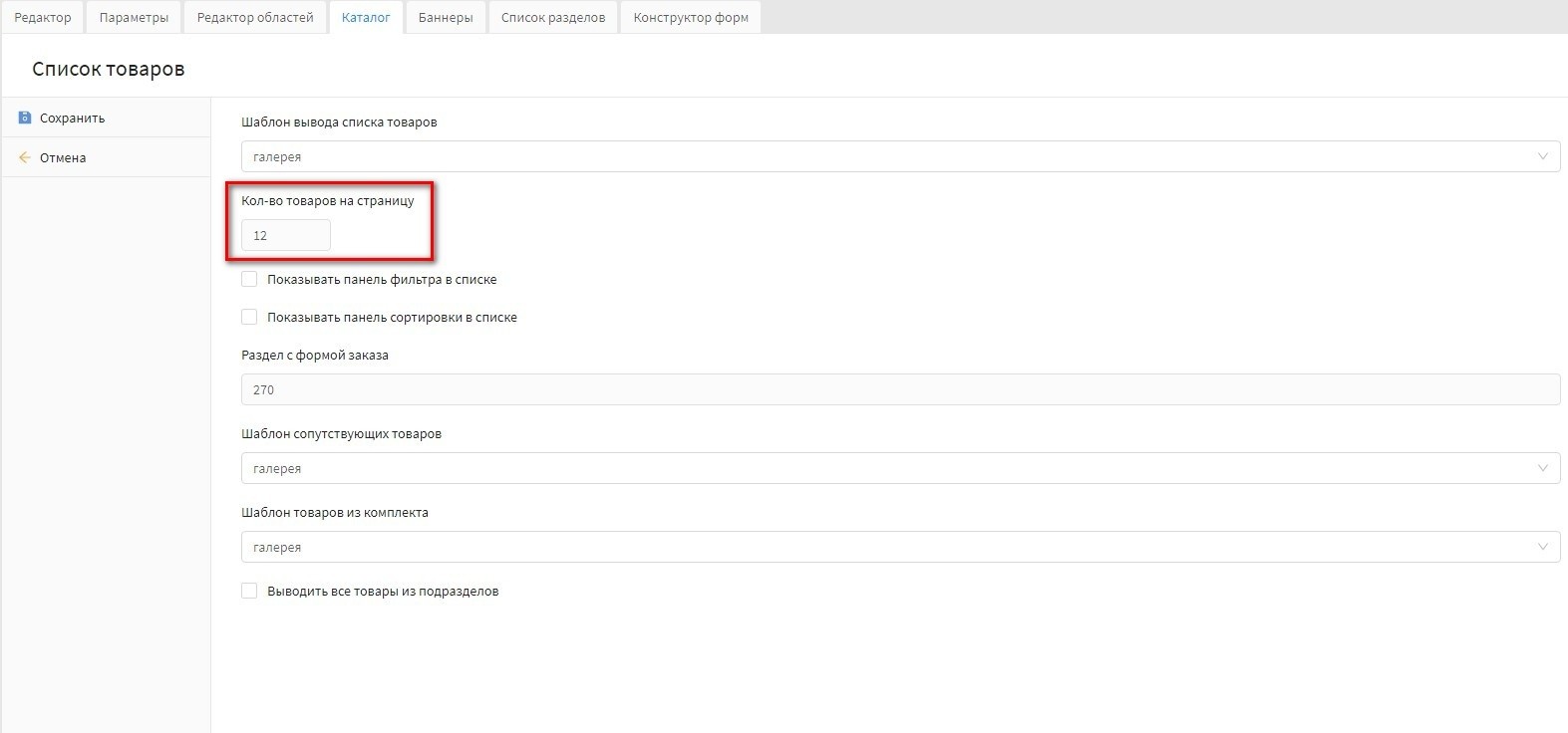 2. Регулирование количества товаров выводимых разделе: