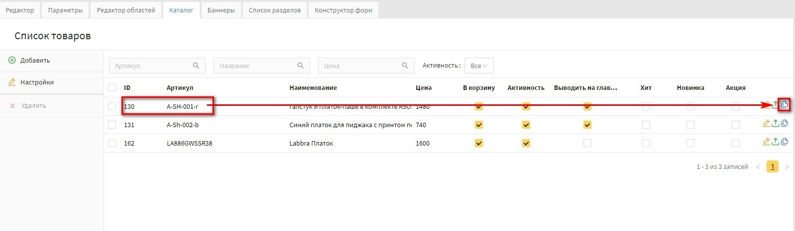 В версии 19.2 Canape CMS добавлена возможность дублирования товаров, это можно сделать как в разделе типа "Каталог", так и в панели "Товары".