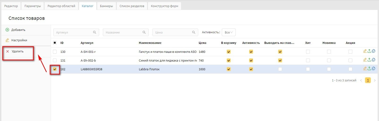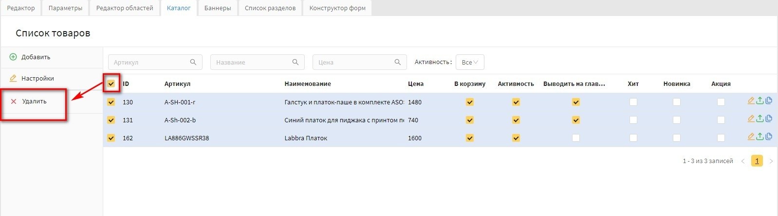 Внимание! Действие удаления можно проводить в рамка одной страницы товаров.