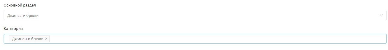 - "Основной раздел" - выпадающий список разделов, в котором указывается основной раздел, где лежит товар. На базе этого параметра определяется, куда будет вести канонический урл.