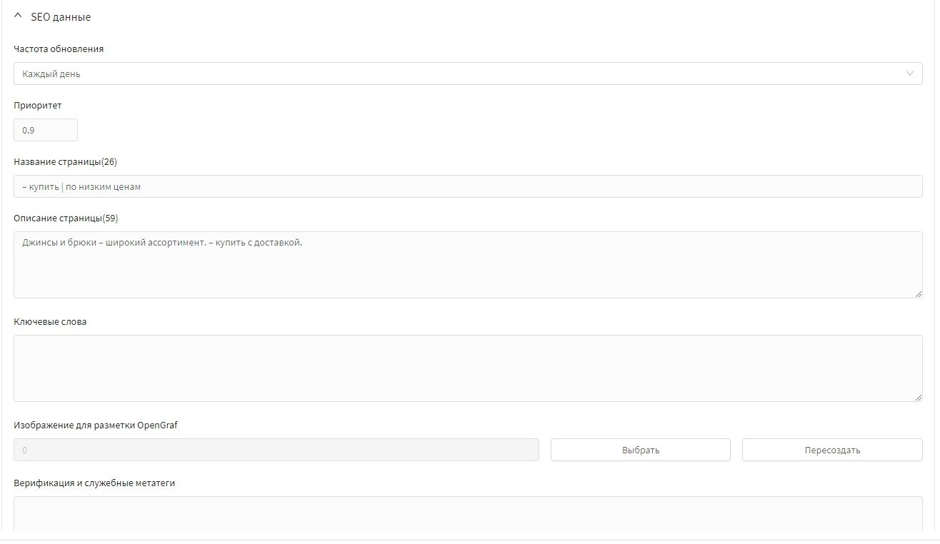 Блок "SEO данные" - в данном блоке можно редактировать seo данные для отдельной товарной позиции. По умолчанию они строятся по шаблону.