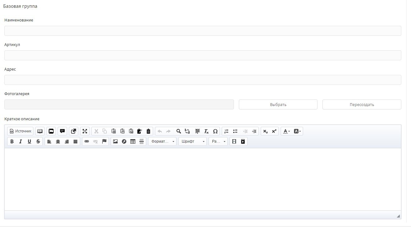 - "Краткое описание" - поле предназначено для ввода краткой информации о товаре.