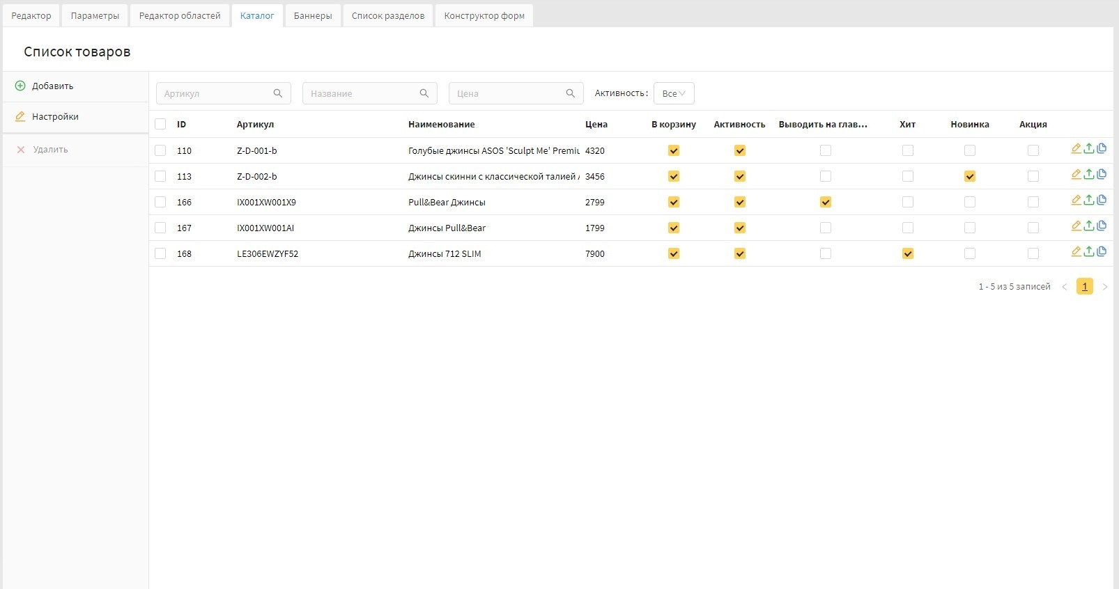 - колонка "Активность" - в колонке выводится параметр "Активность" для товара, его можно редактировать в списке товаров. При установке галочки товар выводиться в разделе.
