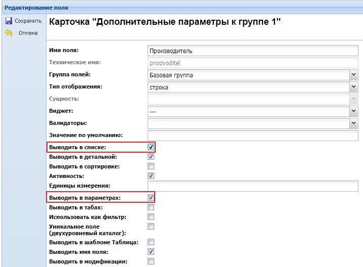 Внимание! Для вывода дополнительного поля на странице списка товаров необходимо установить галочку "Выводить в параметрах". Скриншот