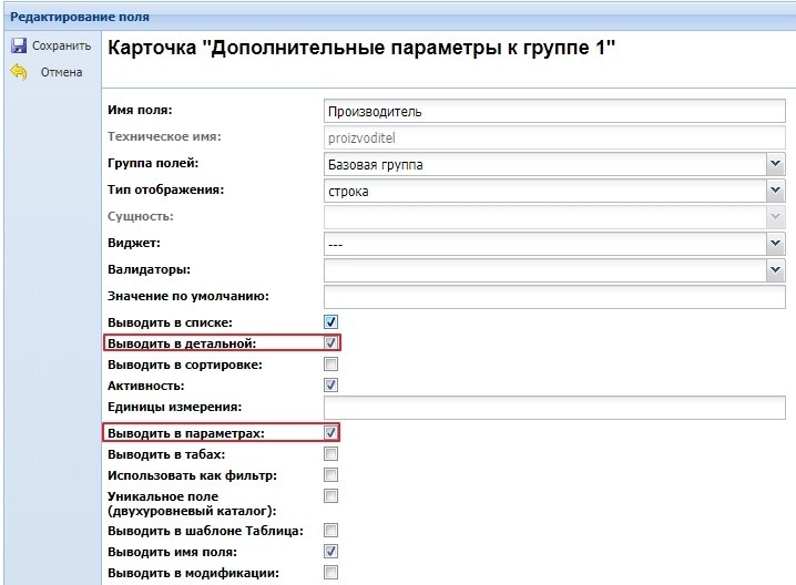 Внимание! Для вывода дополнительного поля на детальной странице товара необходимо установить галочку "Выводить в параметрах". Скриншот