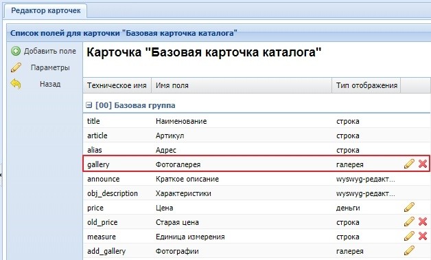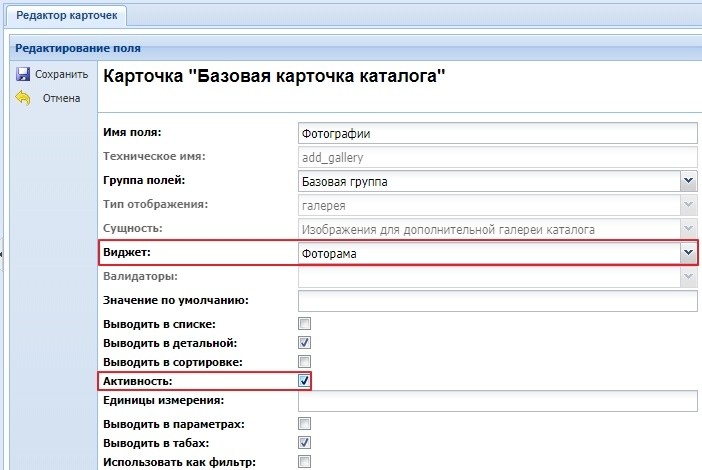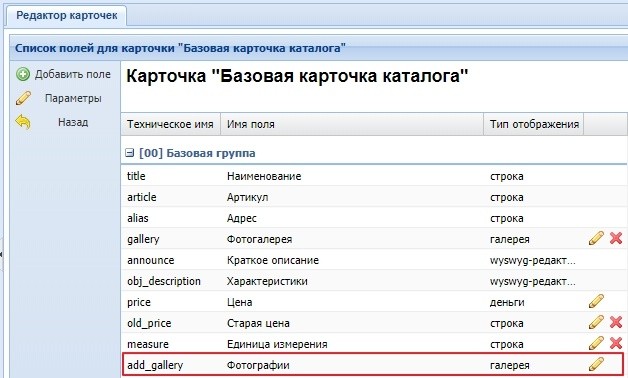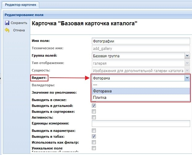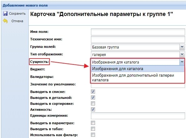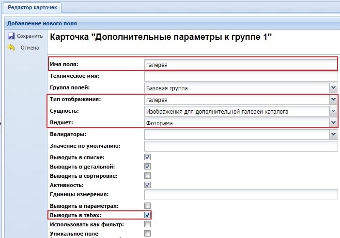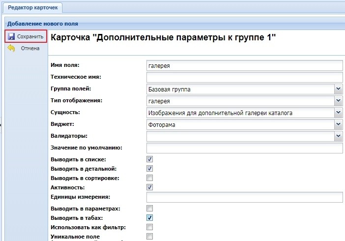 Пример создания дополнительного поля "Галерея" для расширенной карточки:
