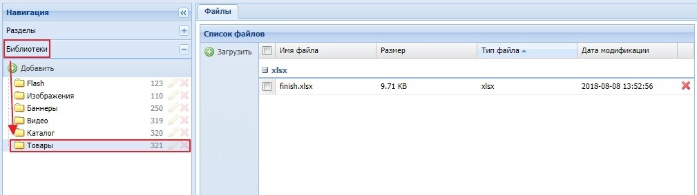 Файлы, добавленные к товару через данный тип поля, загружаются в папку "Товары", в панели "Библиотеки". Скриншот