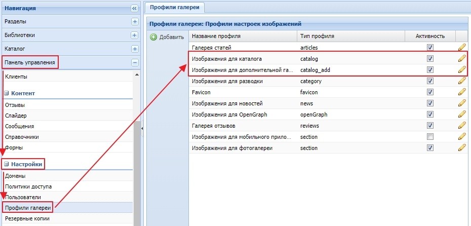 Доступно 2 профиля - "Изображение для каталога"и "Изображение для дополнительной галереи каталога". Профили настраиваются в панели "Профиля галерея". Скриншот.