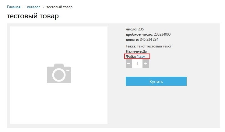 С помощью данного поля можно загружать различные файлы к товарной позиции. На сайте файл отображается целиком, вместе с расширением. Скриншот. При нажатии на файл происходит его скачка.