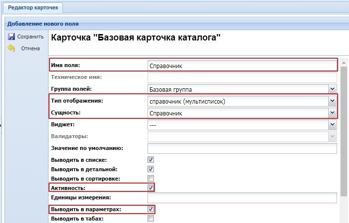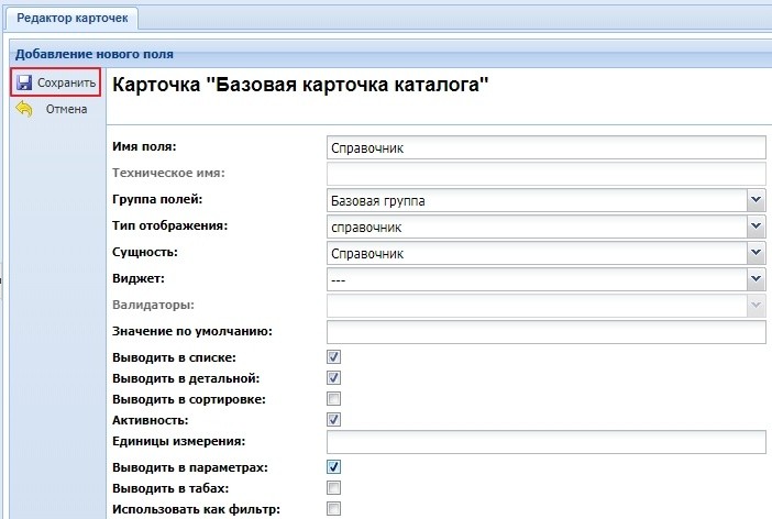 Внимание! После сохранения поля с выбранным справочником в параметре "Сущность" для базовой карточки его изменить нельзя.