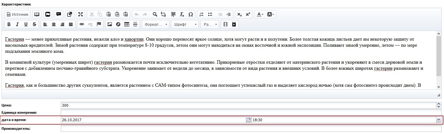 В поле можно вводить любые символы. При добавлении в карточку товара оно отображается как многострочный блок с Wyswyg-редактором. Скриншот