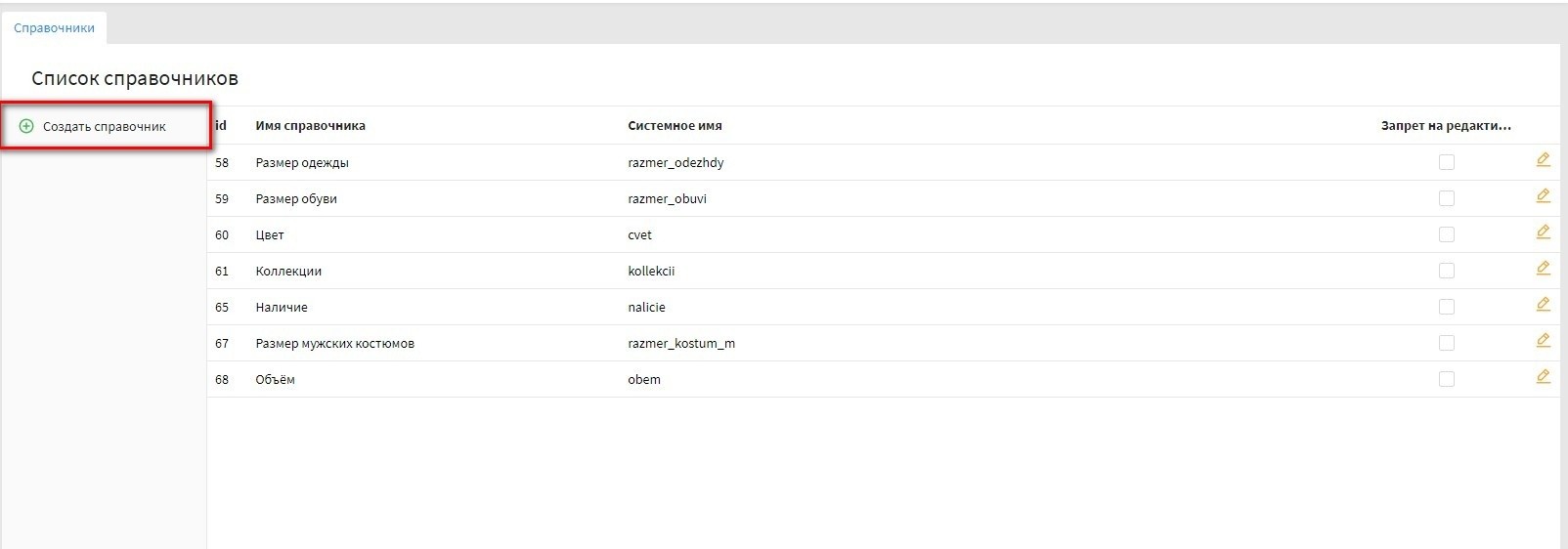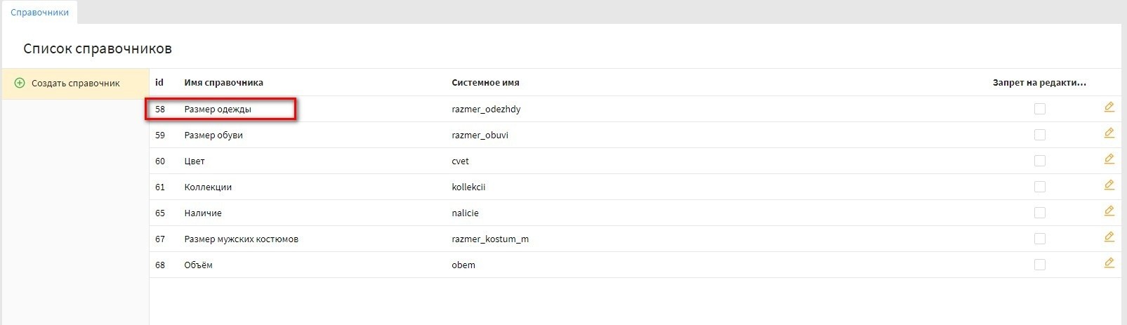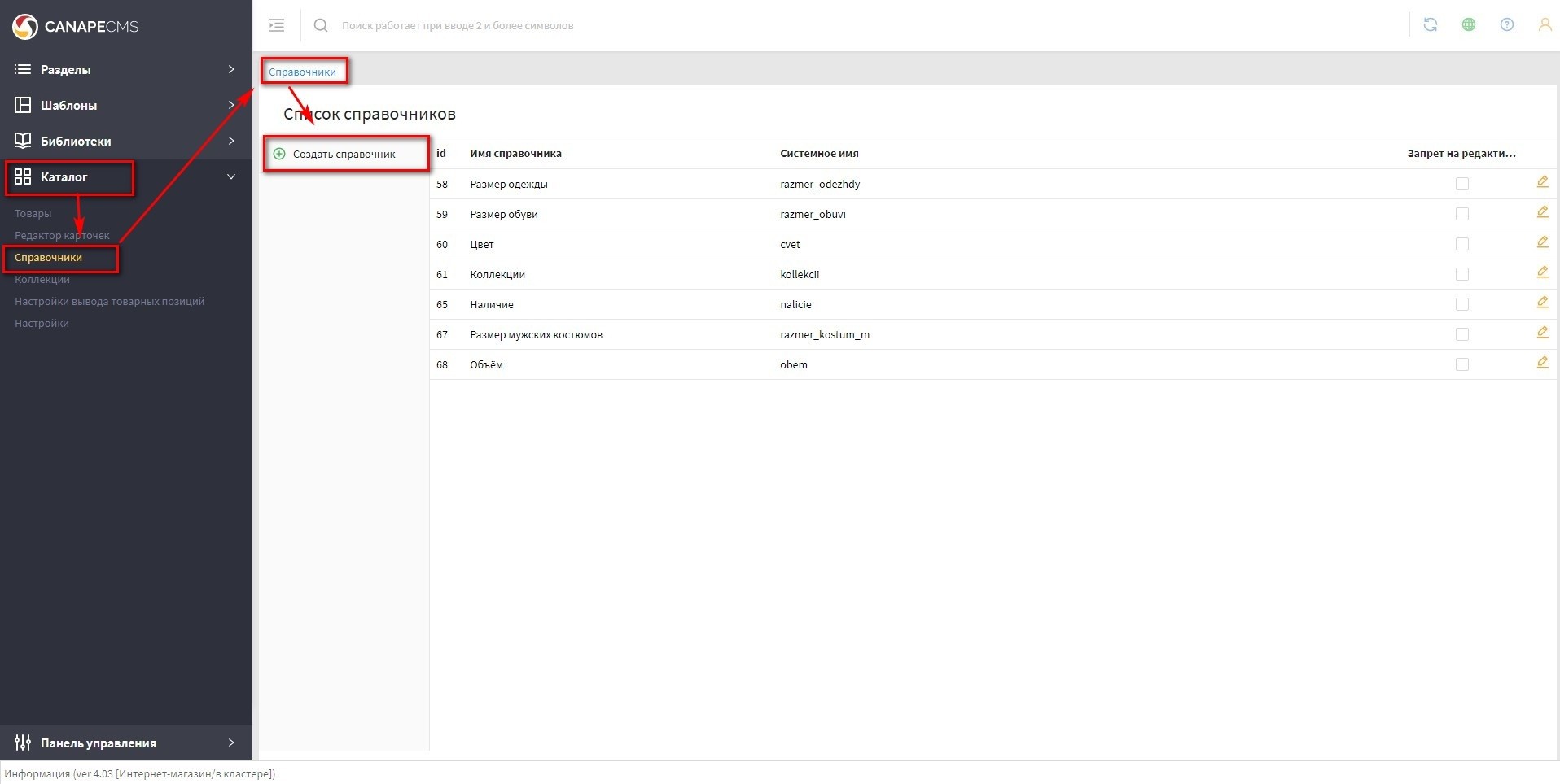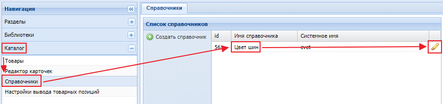 - переходим по "Каталог" - "Справочники", заходим в нужный справочник, нажав на иконку редактирования. Скриншот