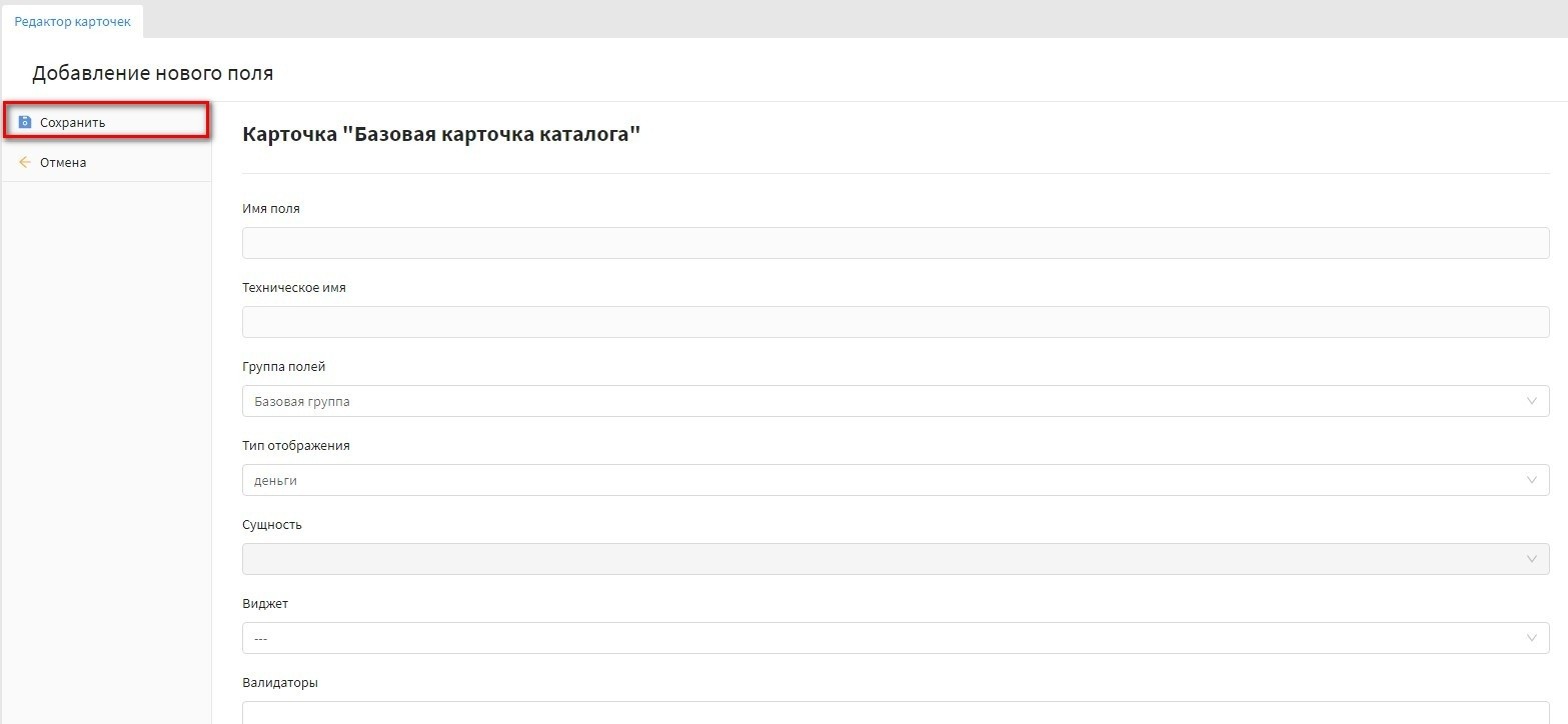 Внимание! После сохранения поля с выбранным справочником в параметре "Сущность" для базовой карточки его изменить нельзя.