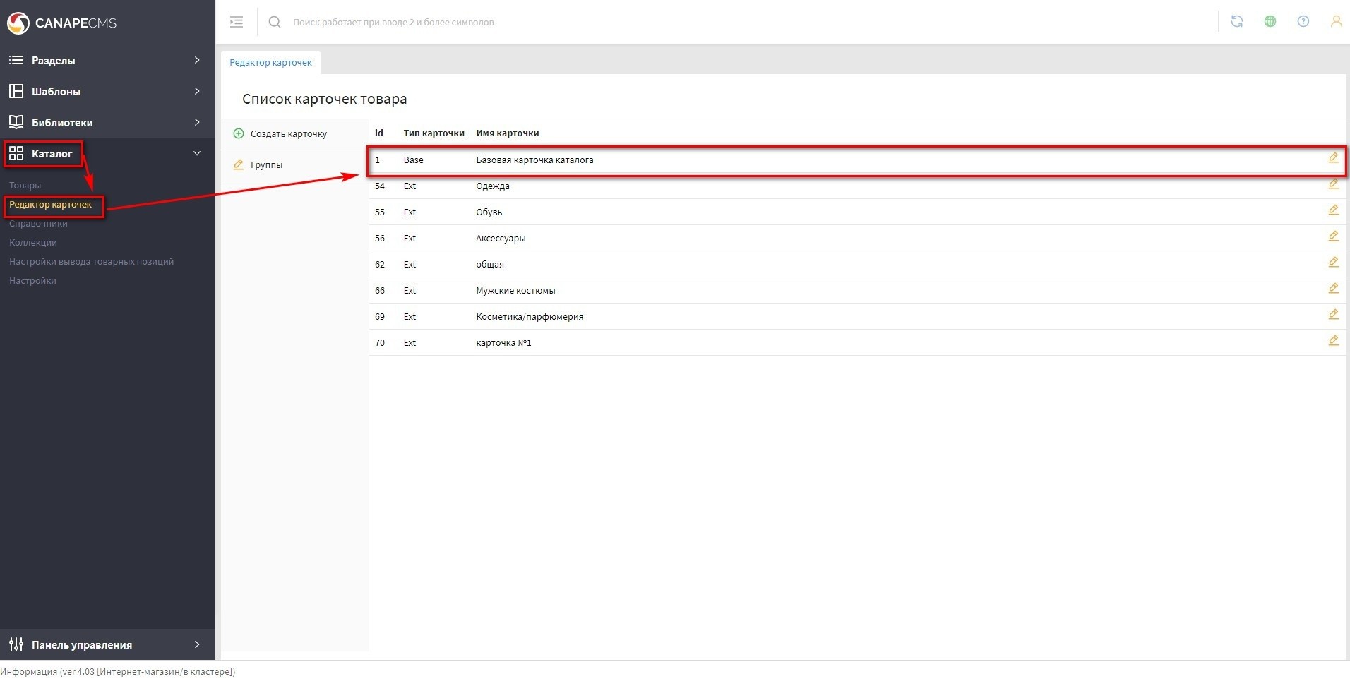 - перейдите в панель "Каталог" - "Редактор карточек", выберите и зайдите в карточку, в которую надо добавить поле. Скриншот