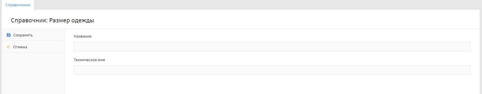 - Техническое поле - данное поле заполнять не обязательно ,т.к. при сохранении справочника поле заполняется автоматически, путем транслитерации параметра из поля "Имя справочника".