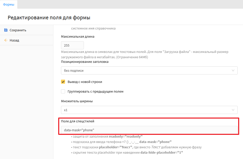 При использовании данного спецстиля readonly="readonly" поле на форме будет отображаться, но заблокировано от заполнения.
