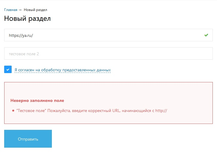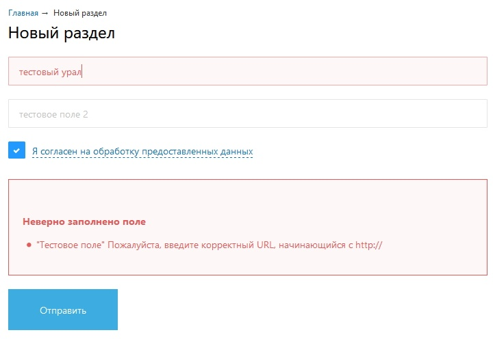 В случае, если в поле введены не корректные данные, то оно подсвечивается и выводится описание ошибки. Скриншот