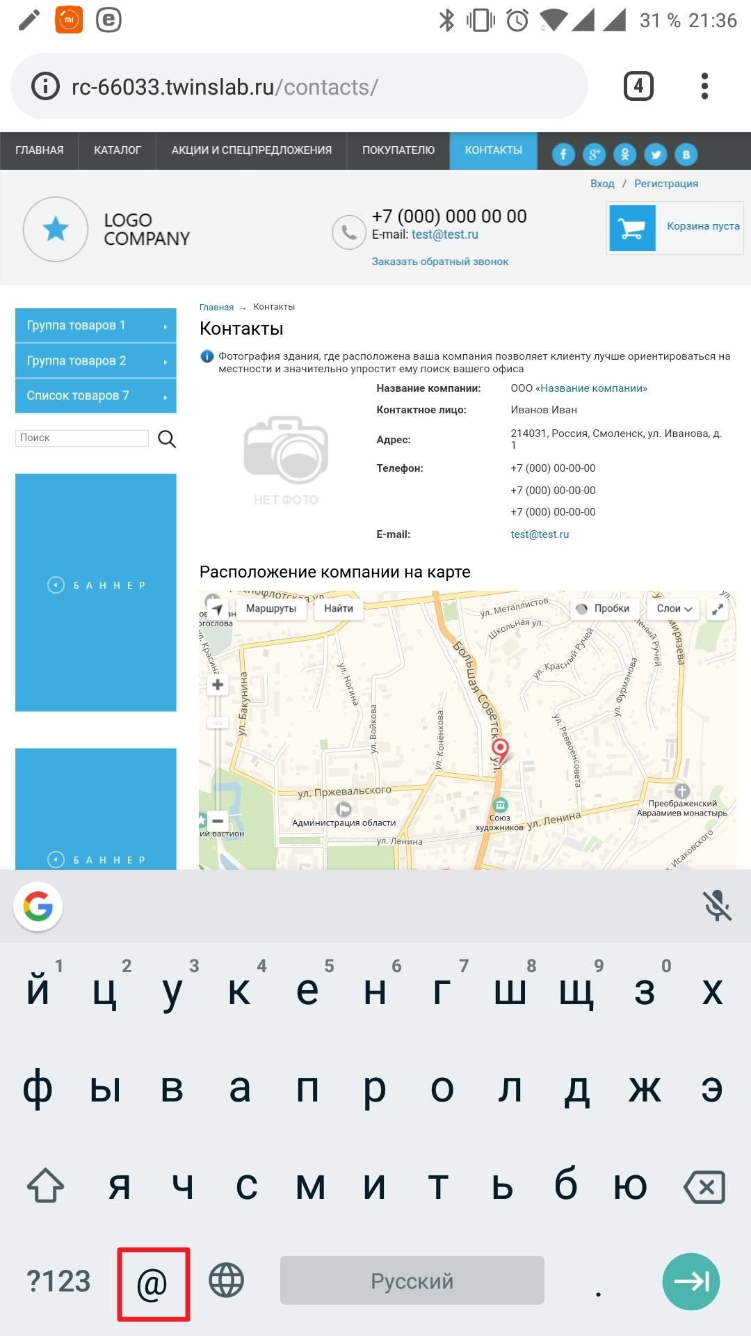 - Email - в поле разрешен ввод только email, формата xxx@xxx.xxx. При заполнении поля с этим типом валидации на мобильном устройстве в клавиатуре отображается символ @. Скриншот