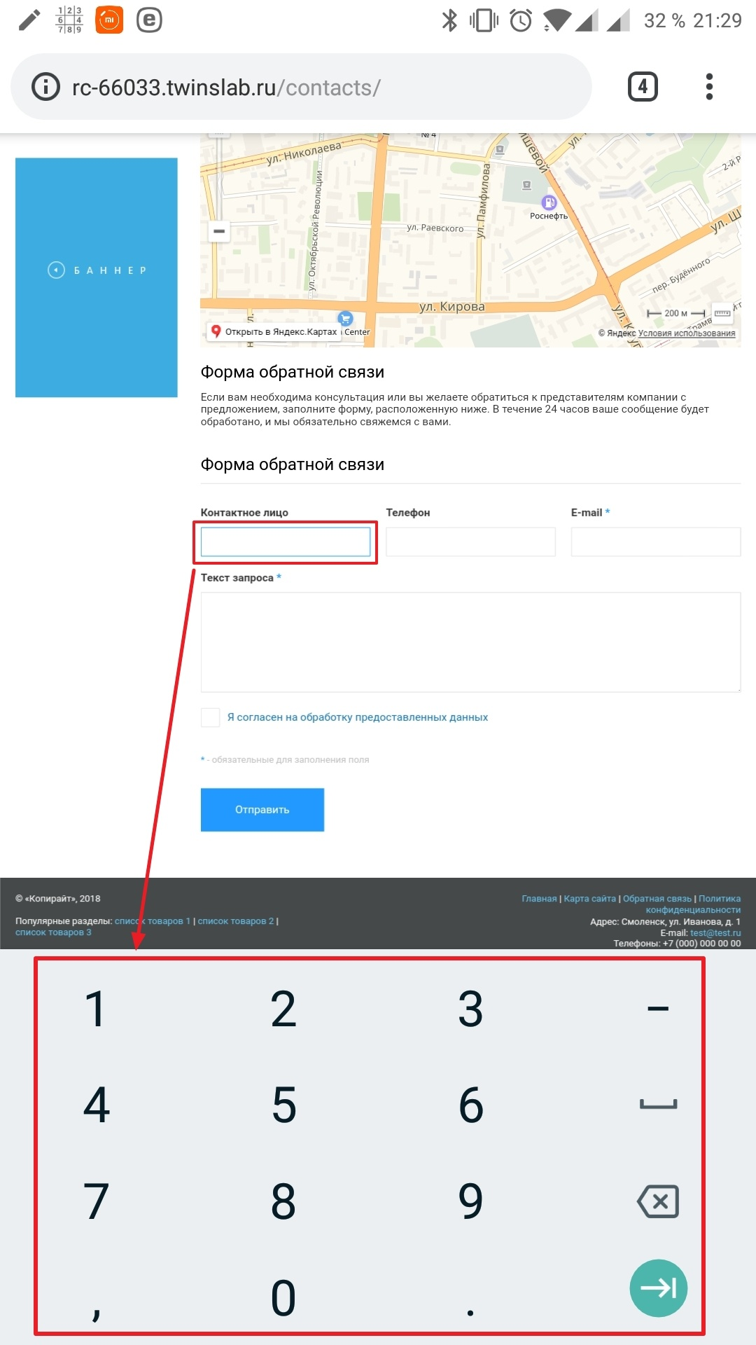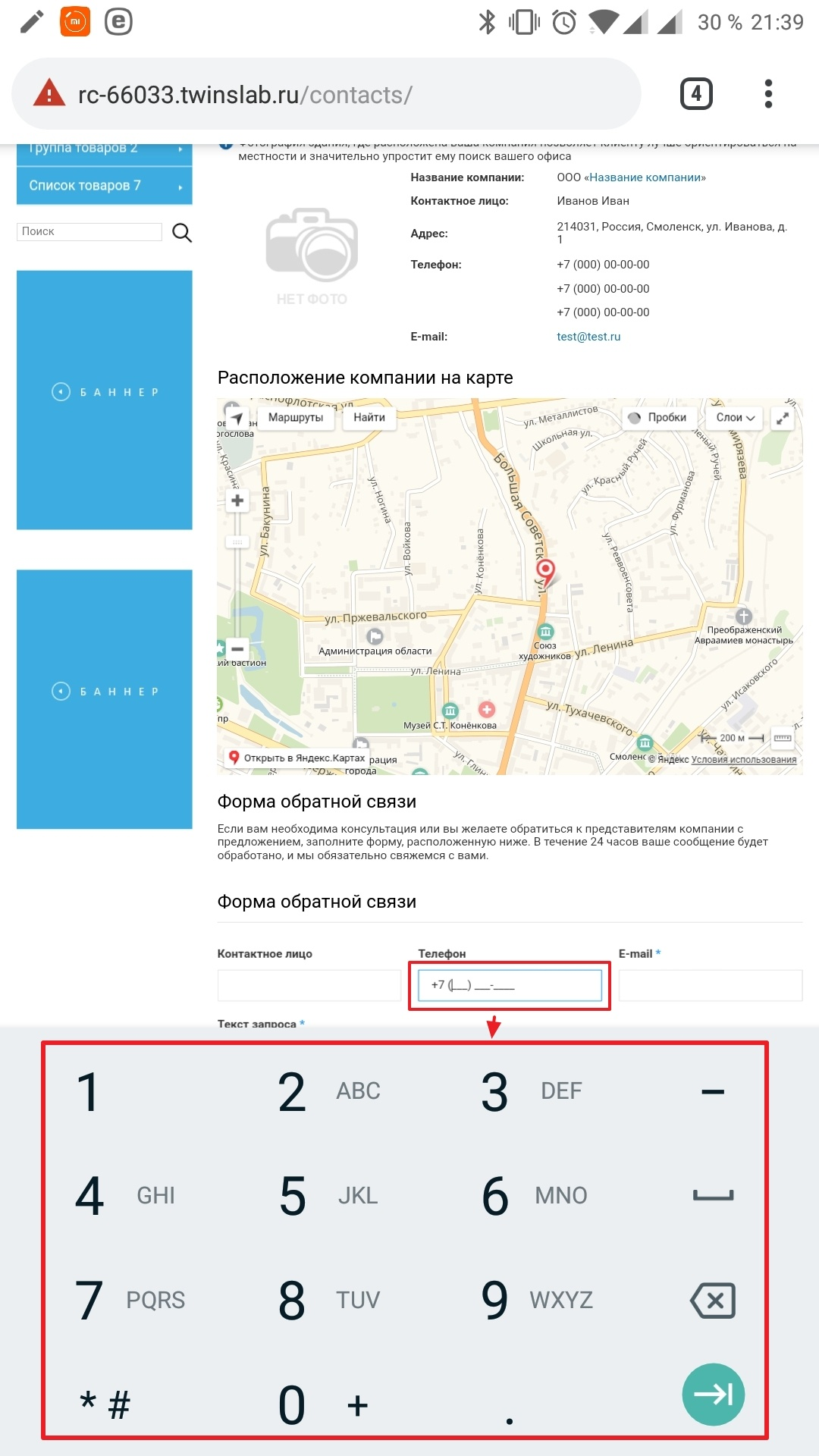 - Телефон - в поле разрешен ввод только цифр. При заполнении поля с этим типом валидации на мобильном устройстве открывается цифровая клавиатура. Скриншот