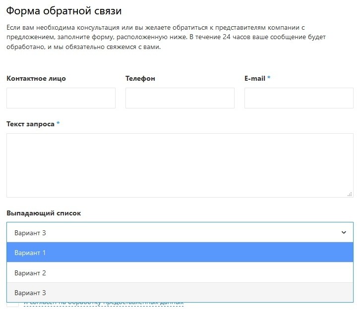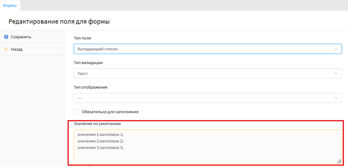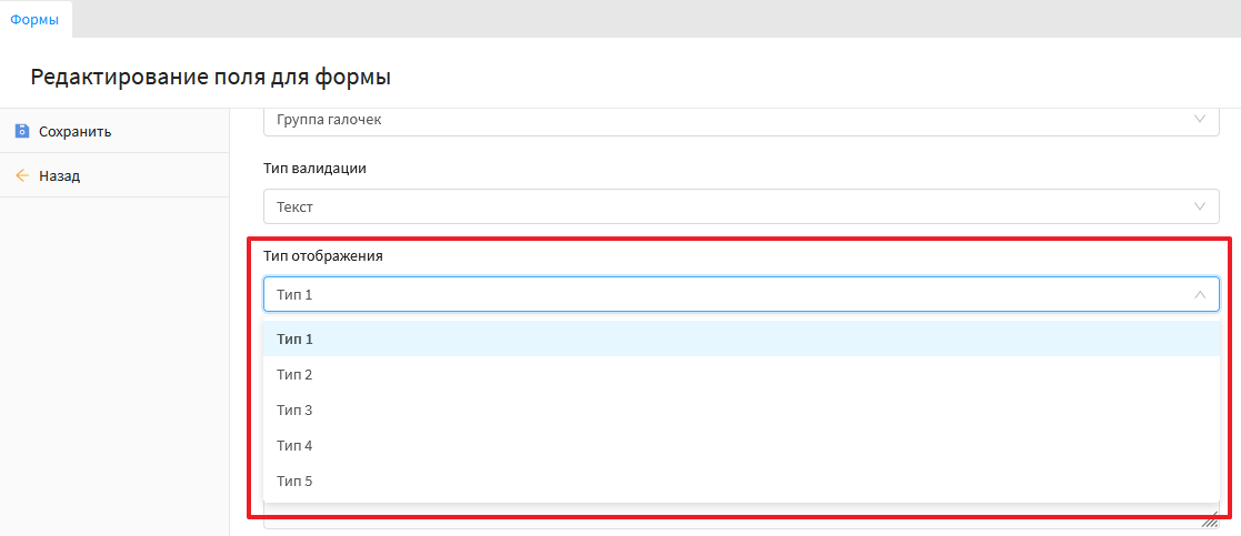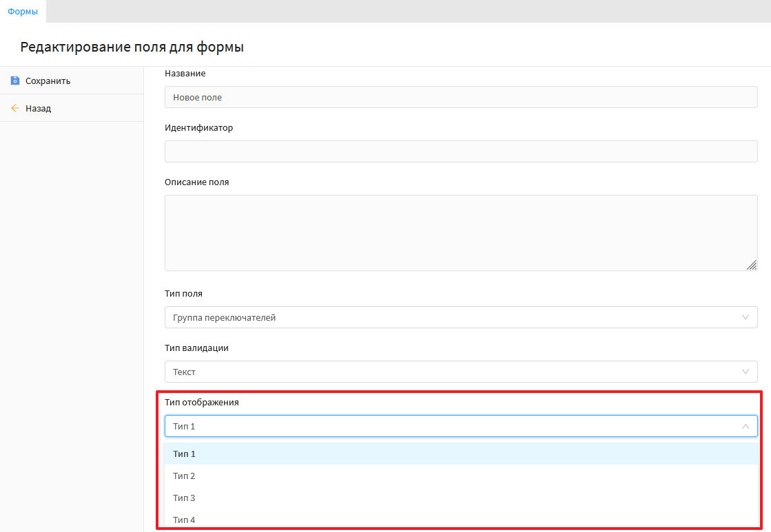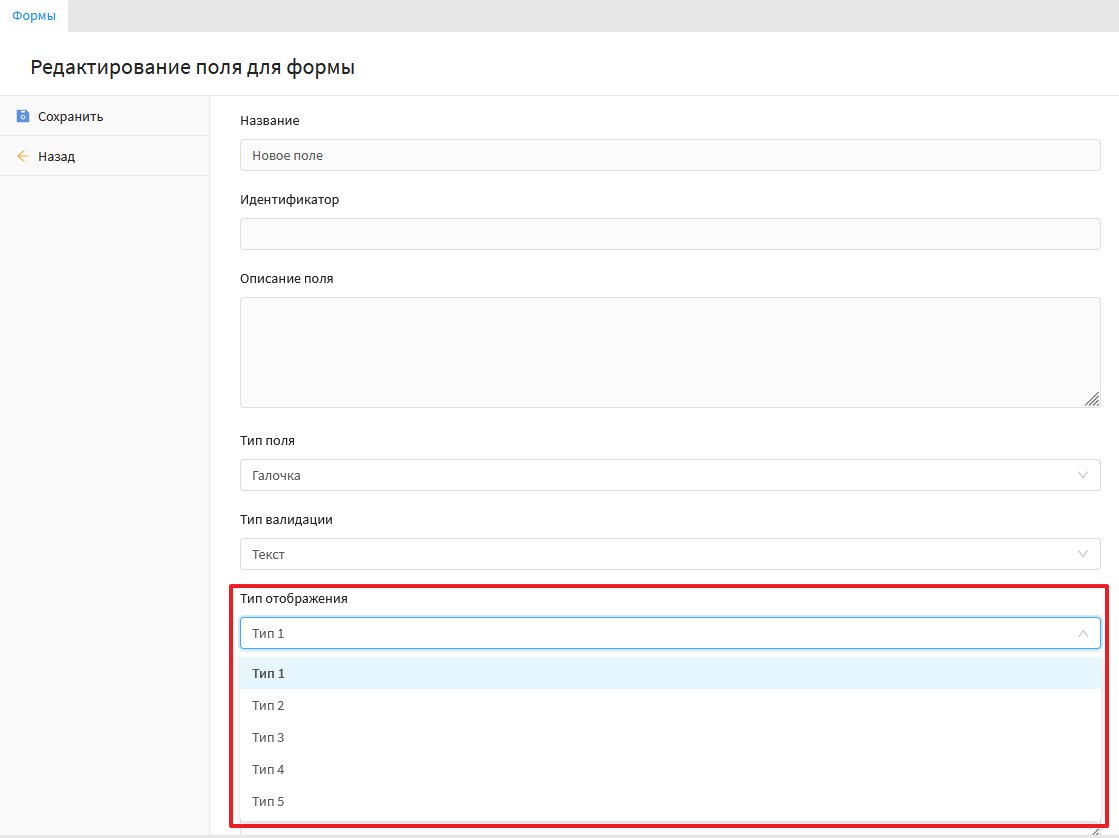 Данный тип поля позволяет вывести значение которое можно выбрать в форме. Скриншот