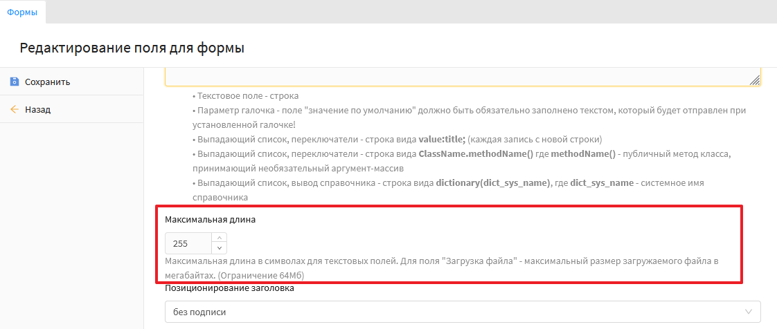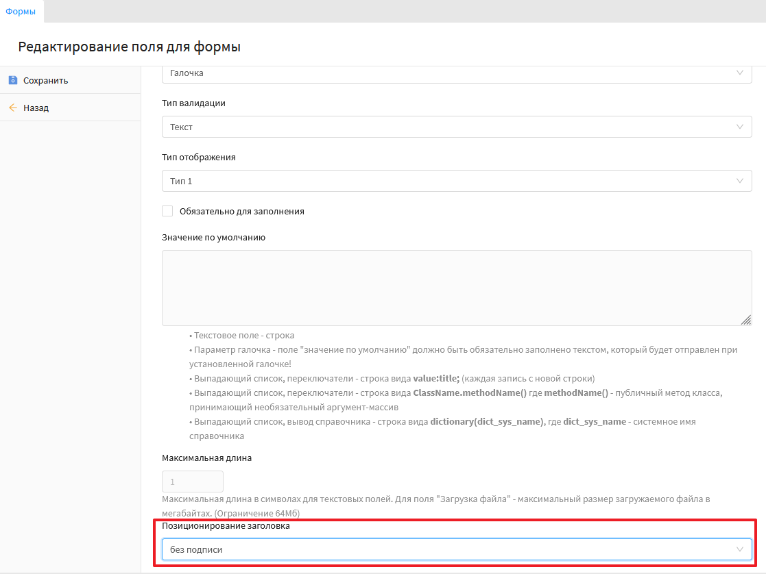 При добавлении данного поля необходимо в параметре "Позиционирования заголовка" нужно выбрать значение "без подписи". Скриншот