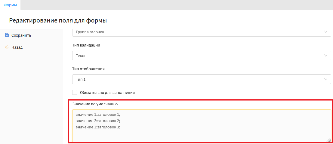 Данный тип поля позволяет выводит сразу несколько значений, из которых должно быть выбрано любое количество значений, или ни одного. Скриншот