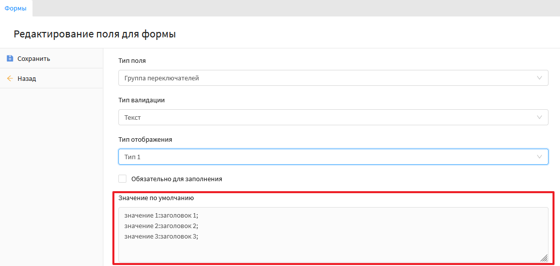 Данный тип поля позволяет выводить несколько значений, из которых должно быть выбрано только 1 значение. Скриншот
