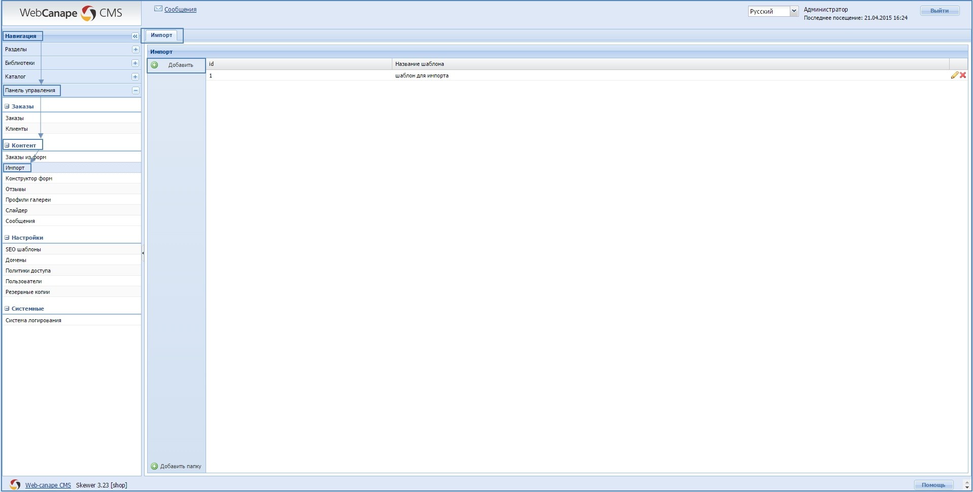 Для этого на детальной странице шаблона нужно нажать кнопку «Импорт»