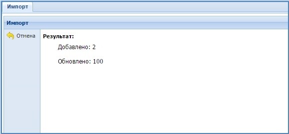 Если импорт повторный и прошел без ошибок, то будет выводится количество обновленных товаров на сайте. Если в импортируемый файл были добавлены новые товары, то будет выводится количество обновленных товаров и добавленных на сайт - скриншот