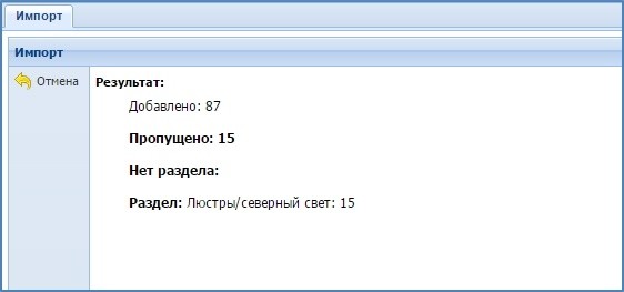 Если в результате импорта, некоторые товары загрузить не удалось, то появится количество добавленных, количество пропущенных товаров при импорте, и появится список разделов не добавленных на сайт - скриншот