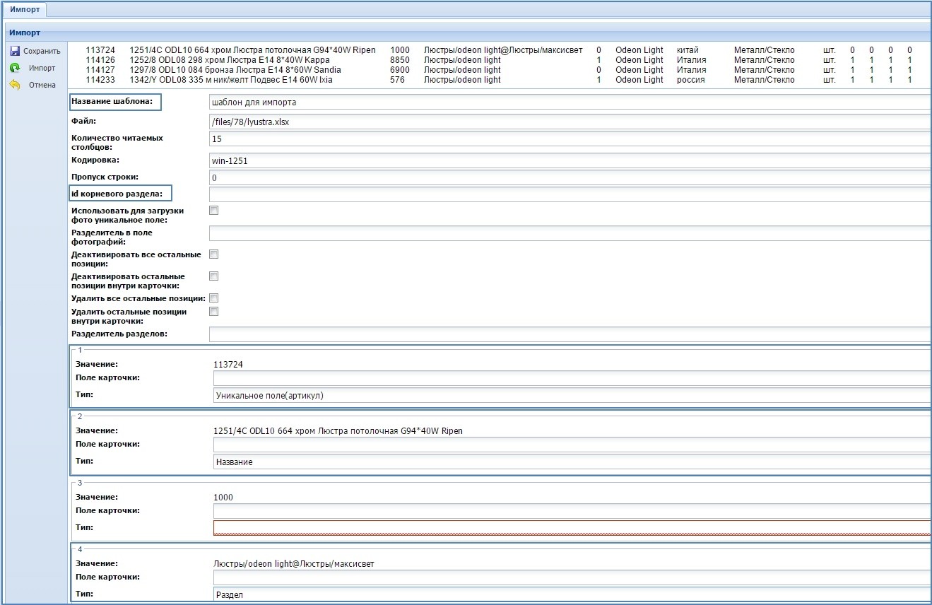 После создания шаблона и настройки полей карточки с полями файла выгрузки можно выполнять импорт товаров на сайт.