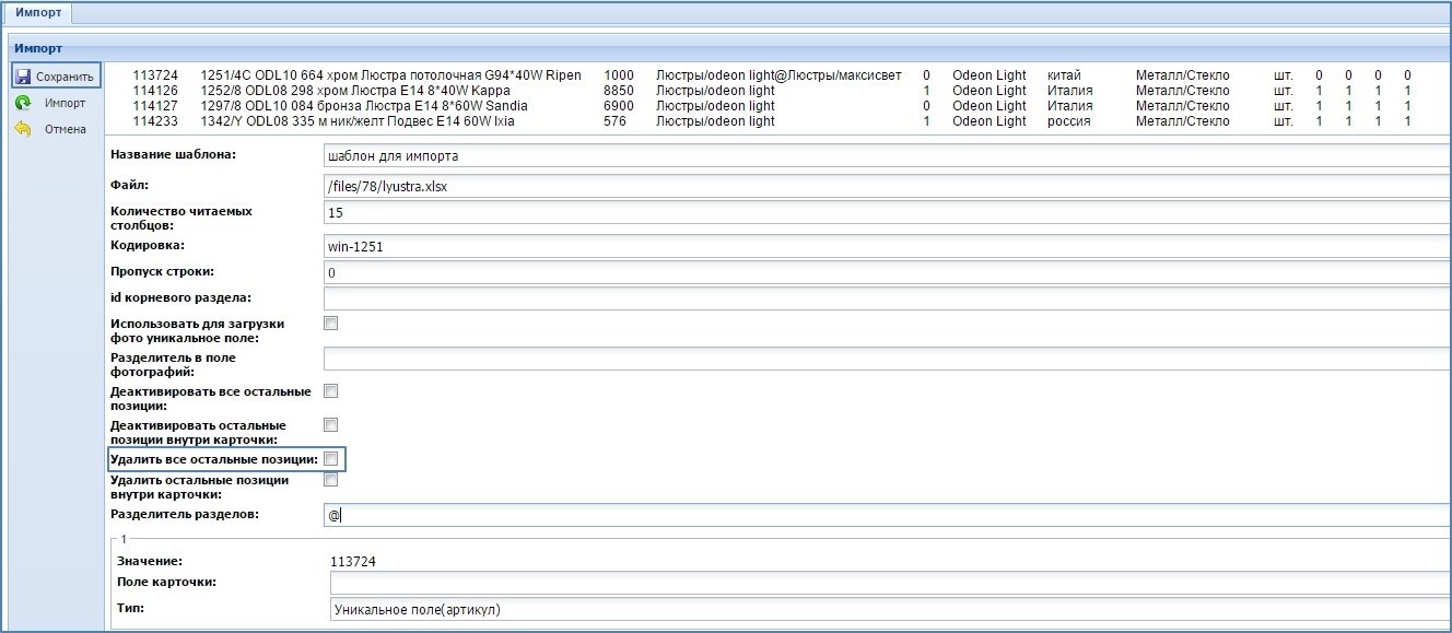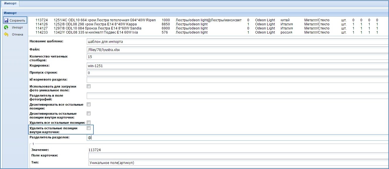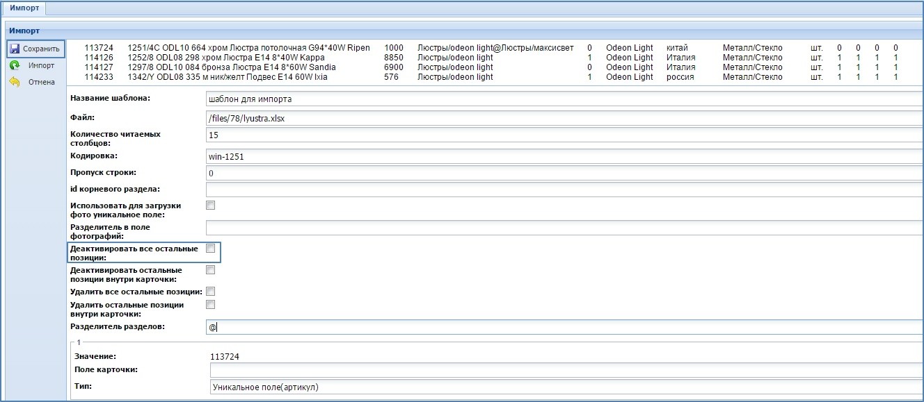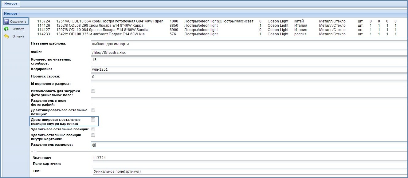 Начиная с версии 3.21.1 и выше, в Canape CMS добавлена возможность разделять импорт по карточкам. Теперь можно удалять или деактивировать товары внутри одной карточки.