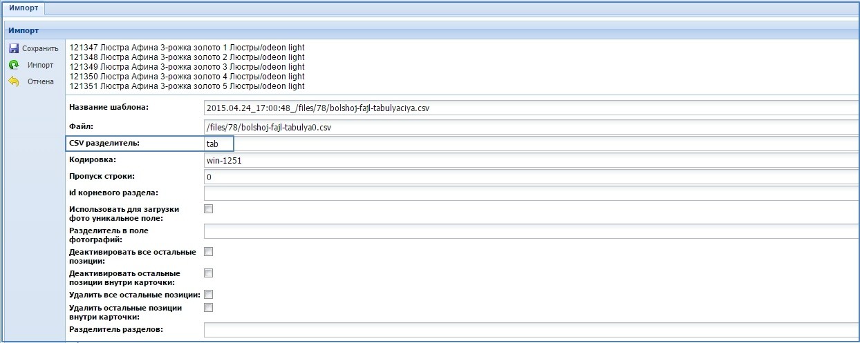 Файл для шаблона импорта можно грузить не только в форматах .xlsx и .xls, но так же в .csv формате с разными типами разделителей.
