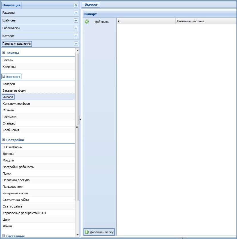 Создаем папку import в корне сайта. Для это необходимо авторизоваться на ftp сервера, перейти в корень сайта и создать папку import. Либо, можно нажать на кнопку «Добавить папку» на вкладке «Импорт». Скриншот