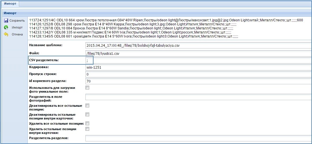 После загрузки файла, в поле "CSV разделитель" необходимо ввести значение - ";" и нажать сохранить. Скриншот