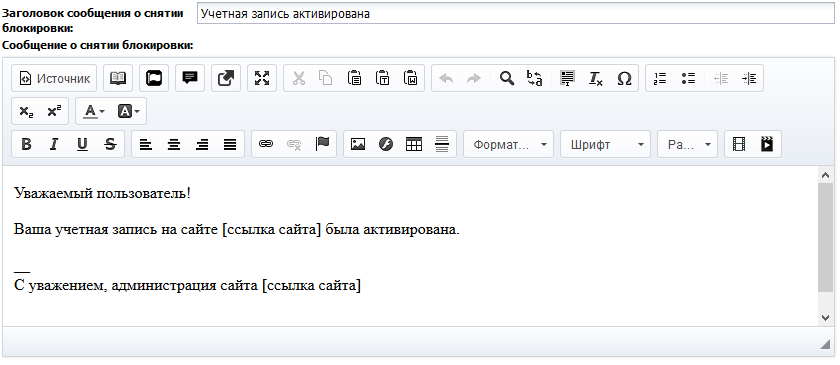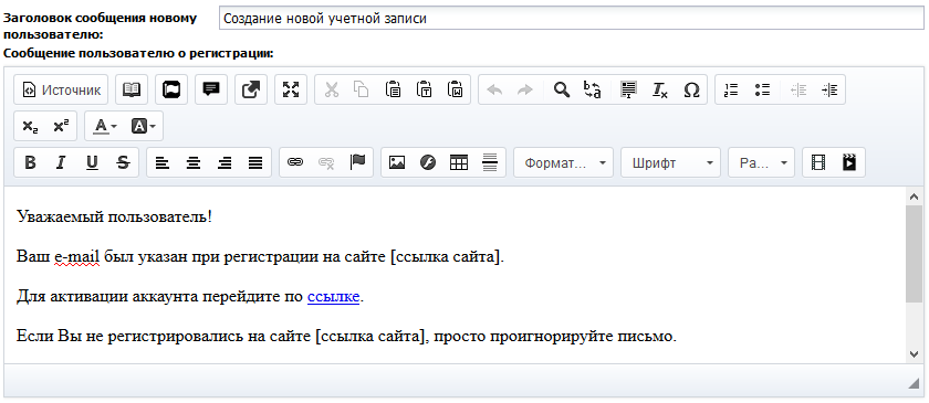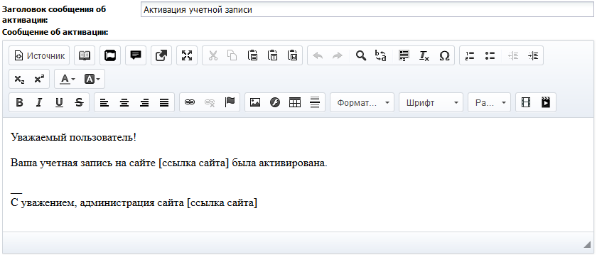 Автоматическая активация - при установке данного типа активации пользователь активируется автоматически. После регистрации, пользователь сразу активируется и попадает в личный кабинет, администратору приходит сообщение о новом пользователе.