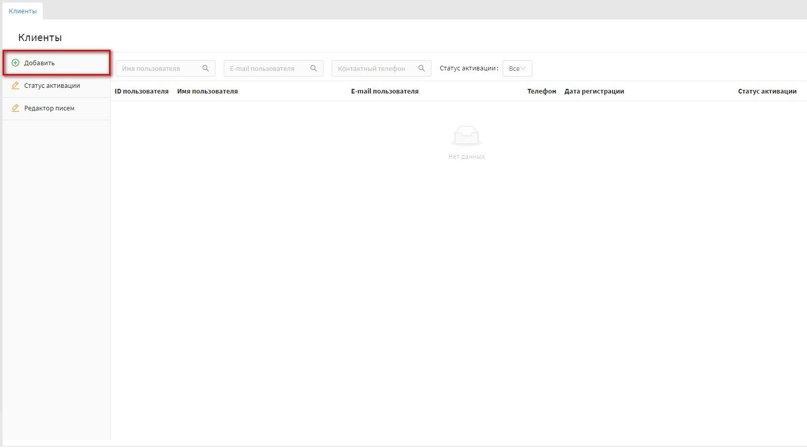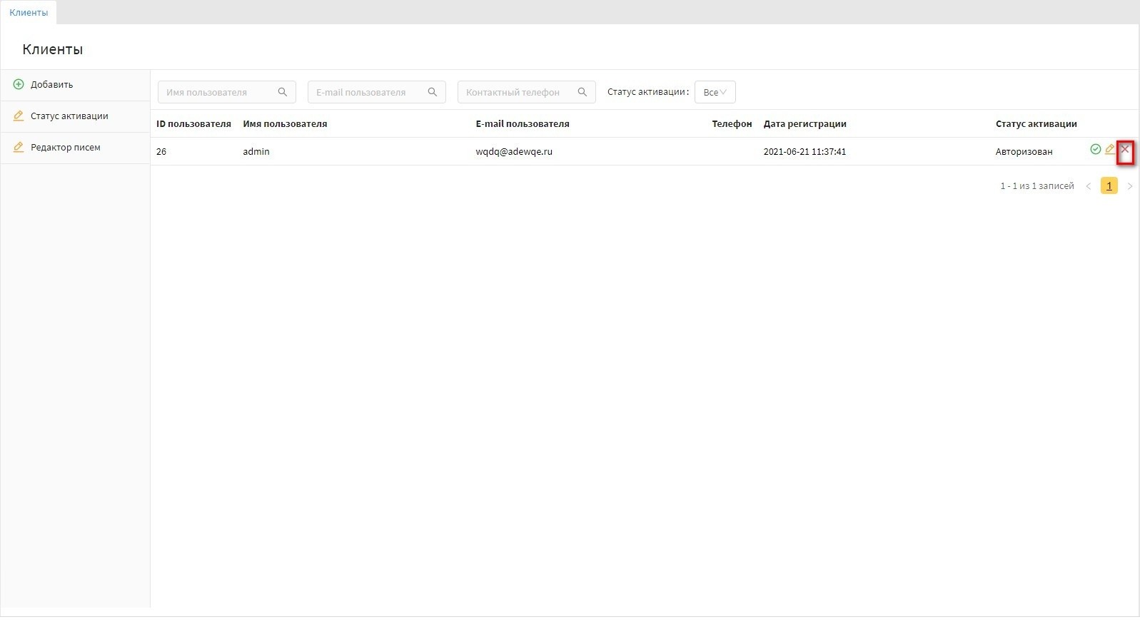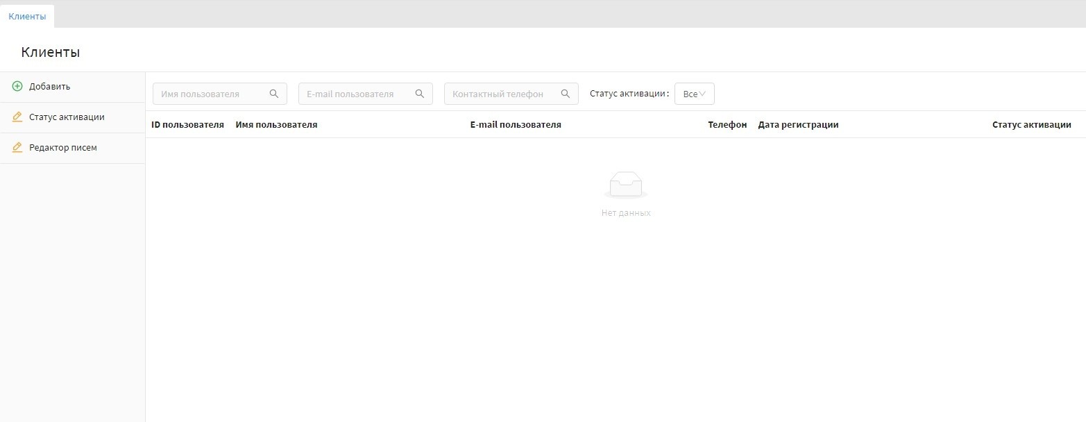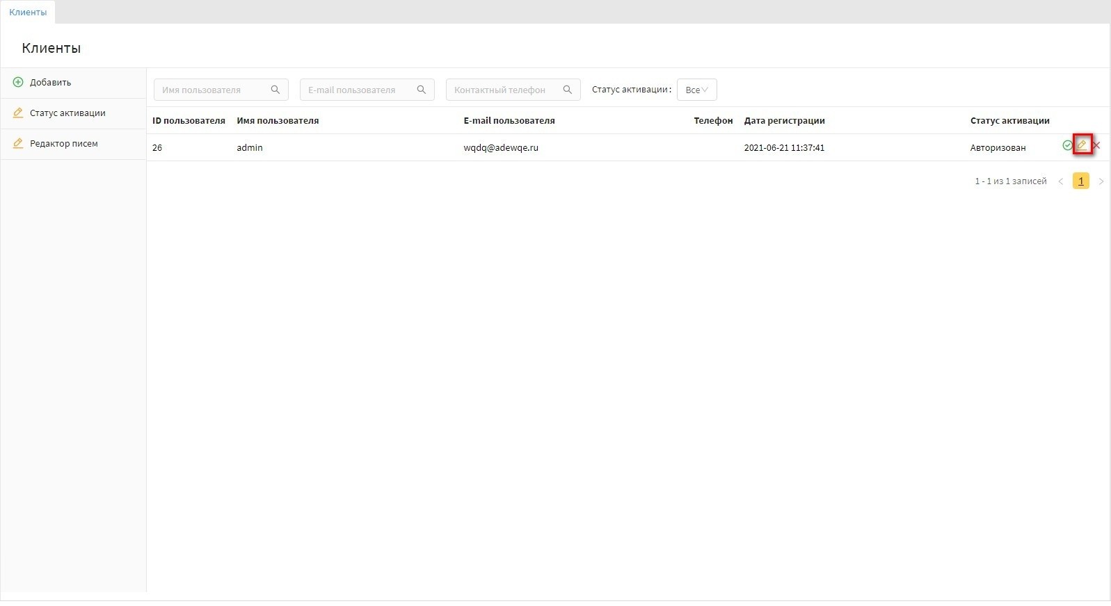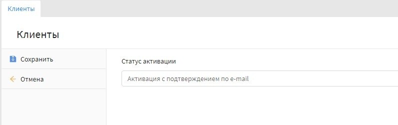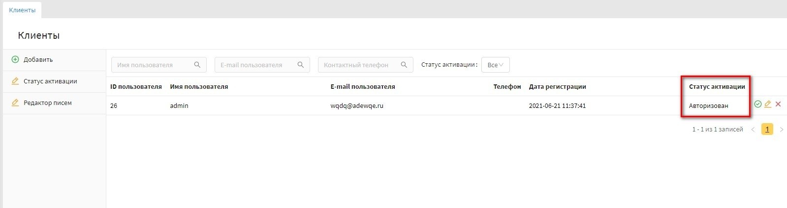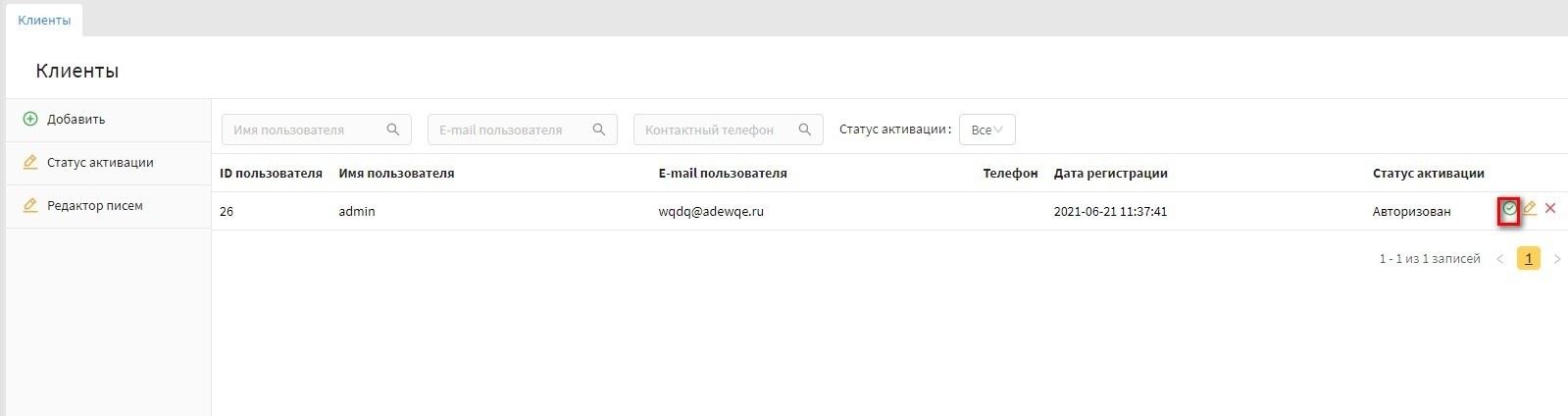 Активация администратором - при выборе данного типа активации администратору необходимо лично активировать учетную запись пользователя. После регистрации, администратору приходит сообщение, что появился новый пользователь, он переходит в панель клиенты и нажимает у нужного клиента иконку активации, после чего пользователю высылается сообщение о том, что учетная запись активна.