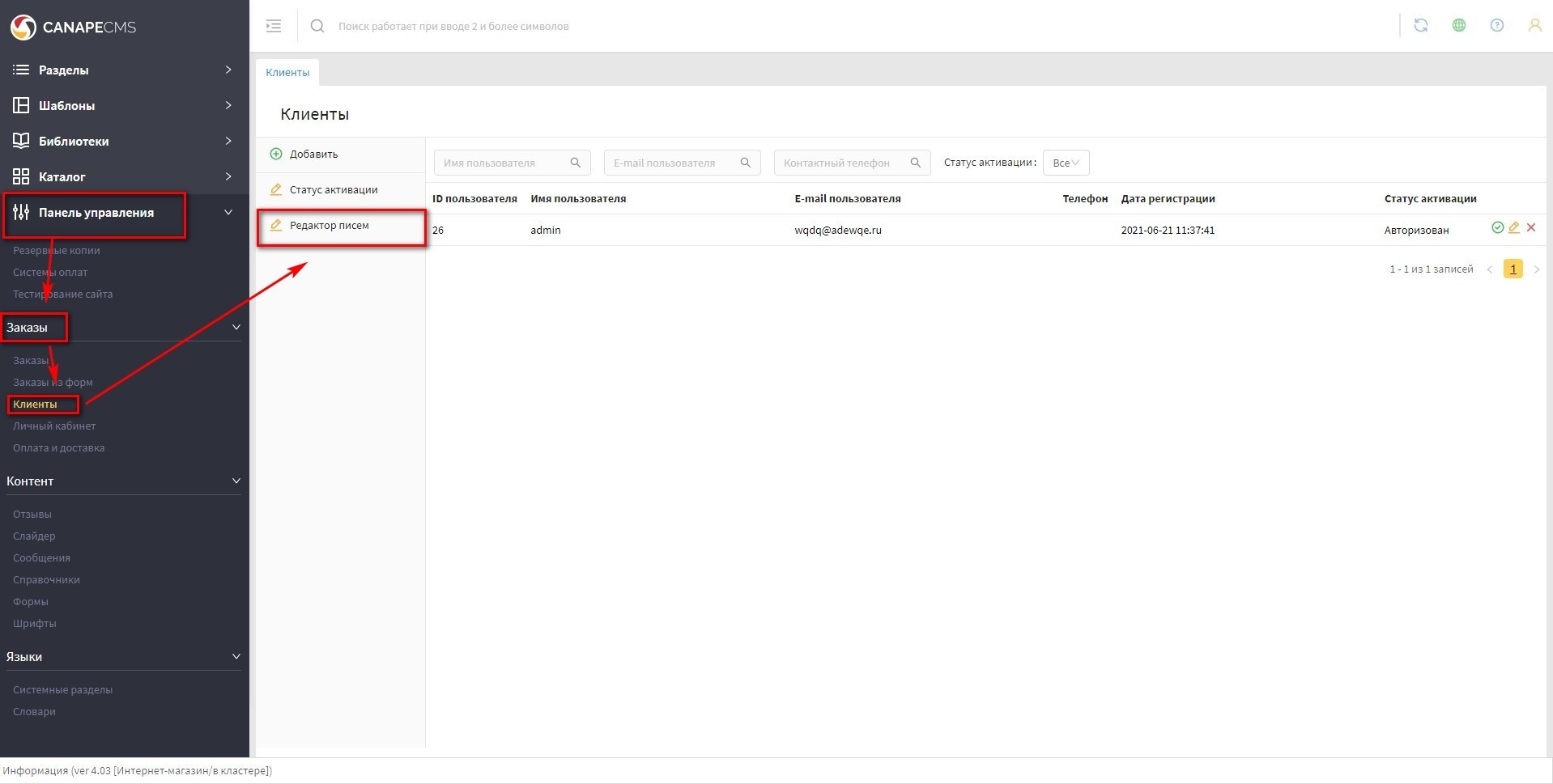 Для перехода в интерфейс необходимо в блоке "Навигация" выбрать пункт "Панель управления" - панель "Клиенты" и нажать на кнопку "Редактор писем".Скриншот.