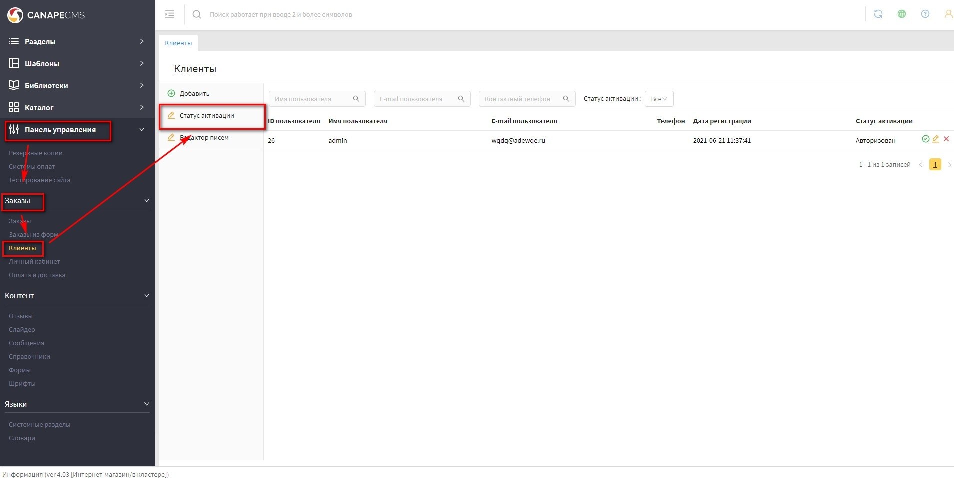Для перехода в интерфейс необходимо перейти в "Панель управления" - гр. "Заказы" - "Клиенты" и нажать на кнопку "Статус активации". Скриншот