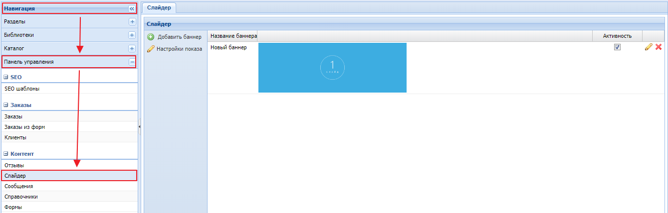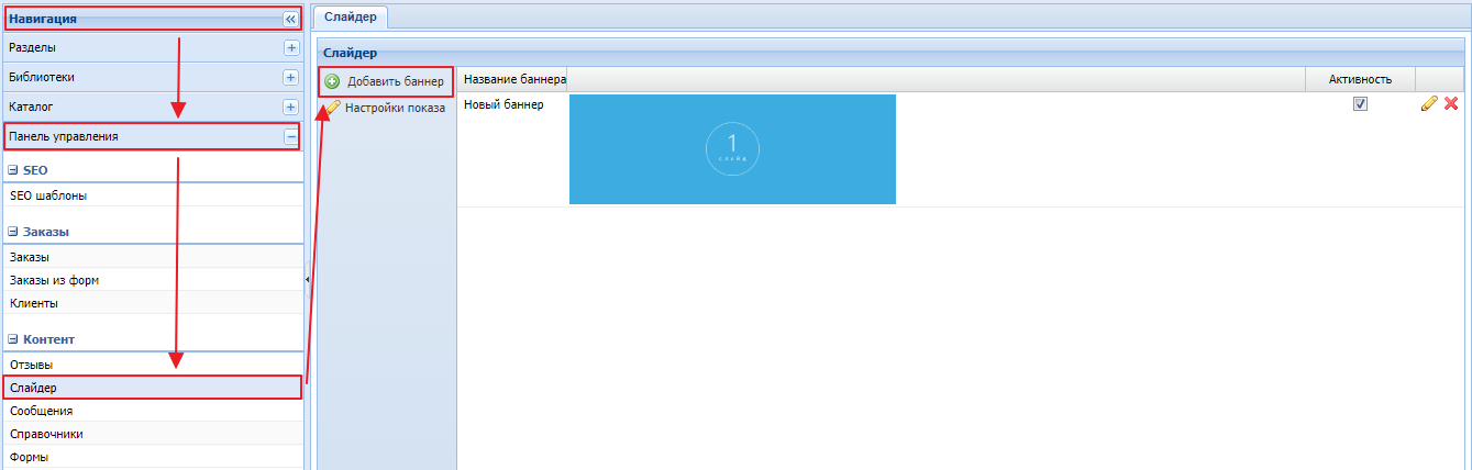 в блоке "Навигация" выбираем пункт "Панель управления" - панель "Слайдер" и в центральном блоке нажимаем "Добавить баннер". Скриншот.