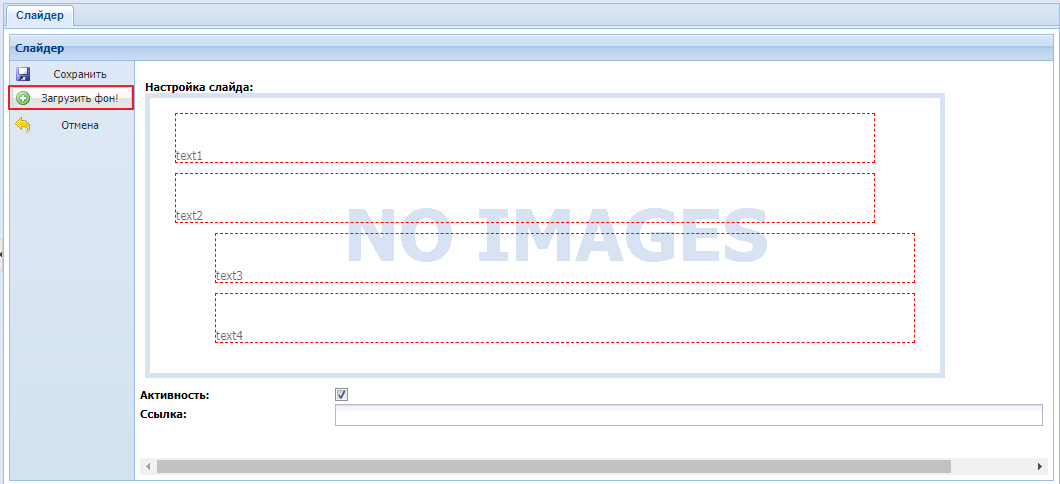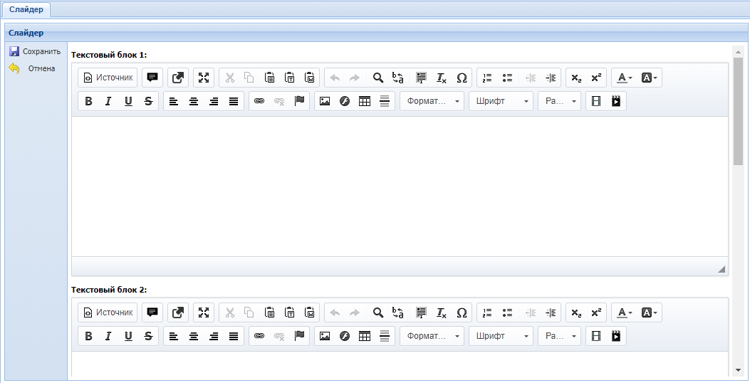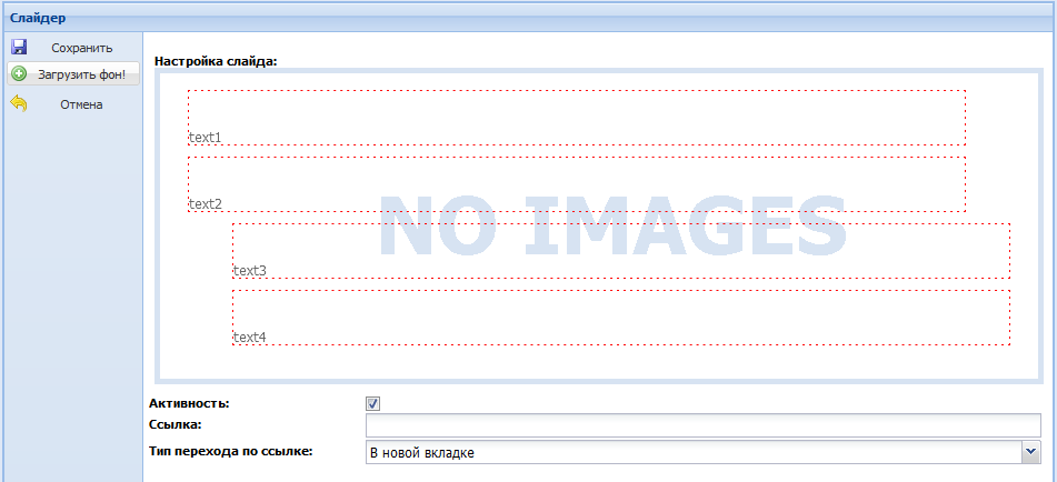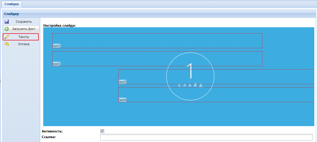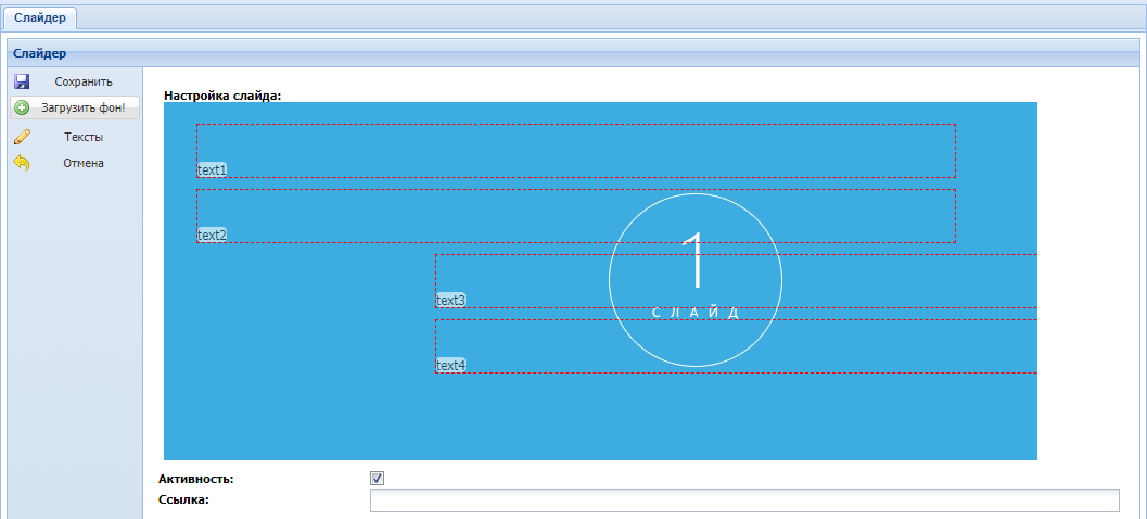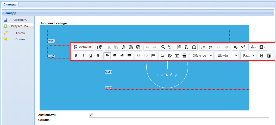 После загрузки слайда можно добавить для него надписи, ссылки или дополнительные изображения через всплывающий WYSIWYG-редактор, который отображается, если установить курсор в один из текстовых блоков слайда. (Скриншот) Всего таких 4 текстовых блока.