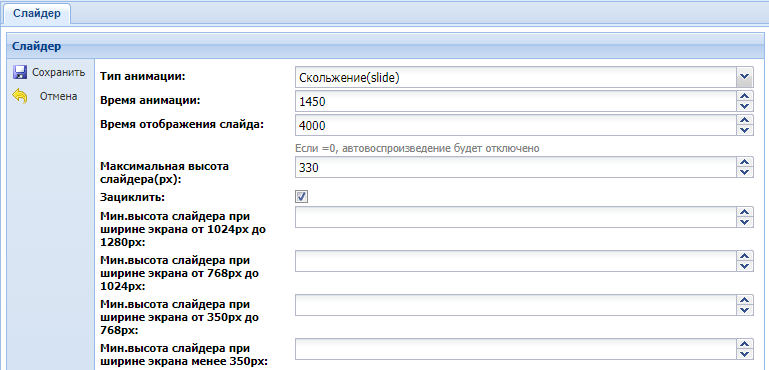 Время анимации - в данном поле указывается время, за которое будет проходить анимация смены слайда.