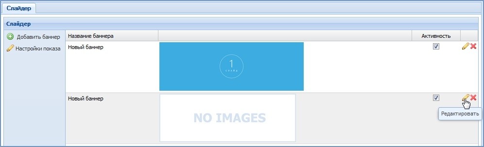 в центральном блоке выбираем из списка нужный слайдер, дважды кликнув по нему мышкой или нажав кнопку «Редактировать». Скриншот