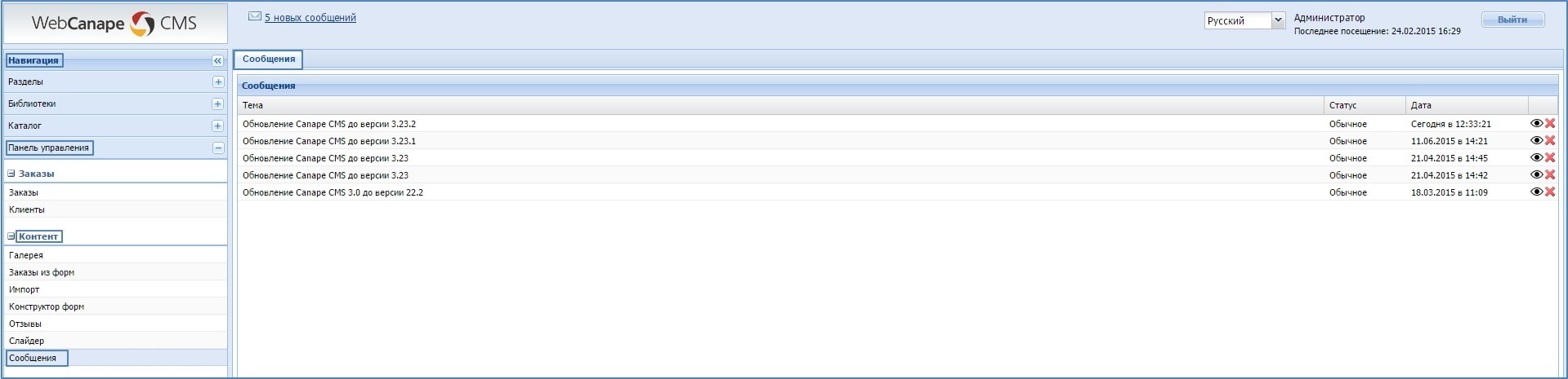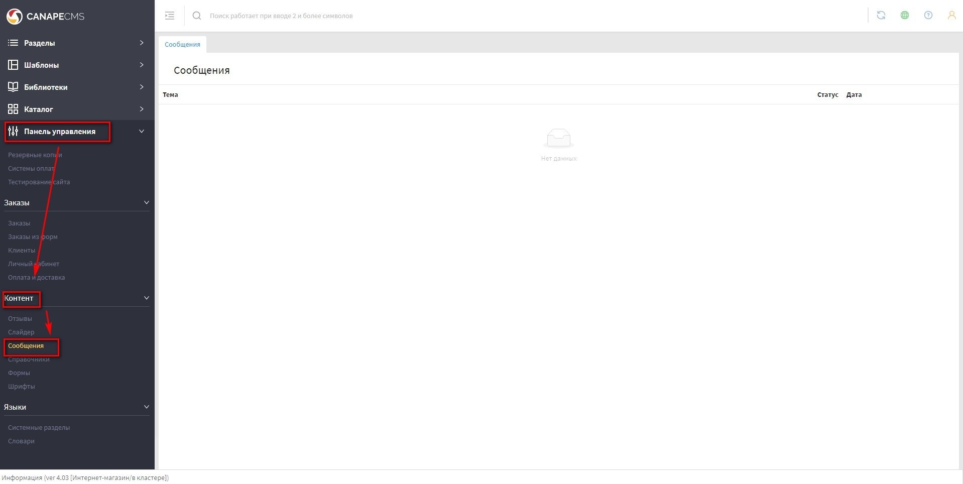 В блоке "Навигация" зайти в "Панели управления" - гр. "Контент" - "Сообщения". Скриншот