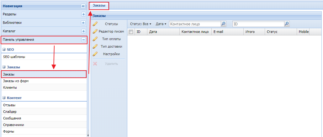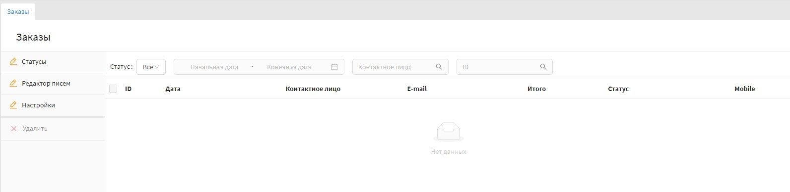 в центральном блоке откроется вкладка "Заказы", где можно посмотреть все оформленные на сайте заказы