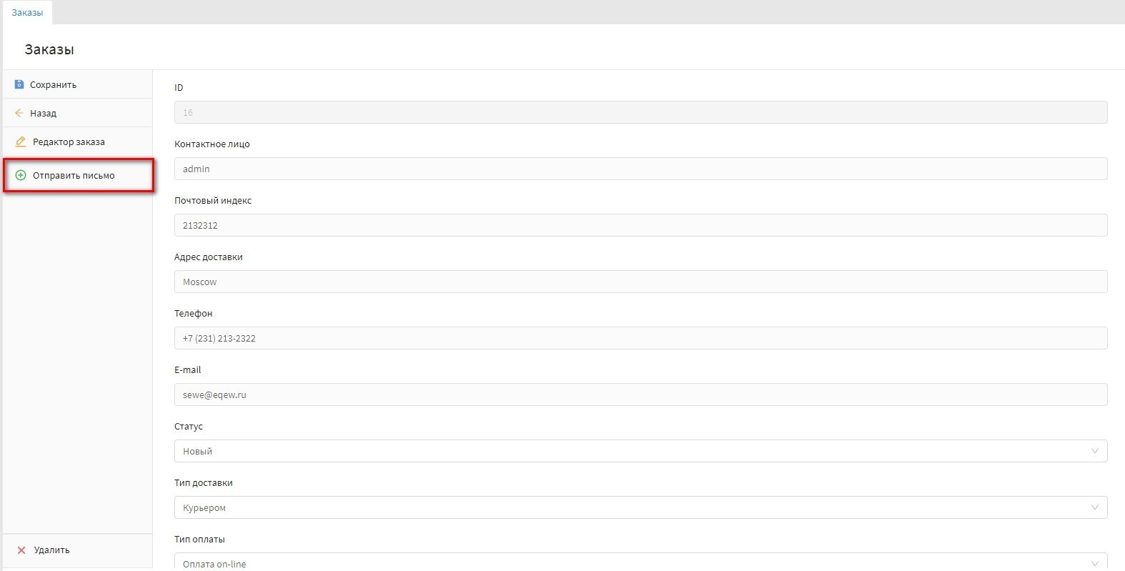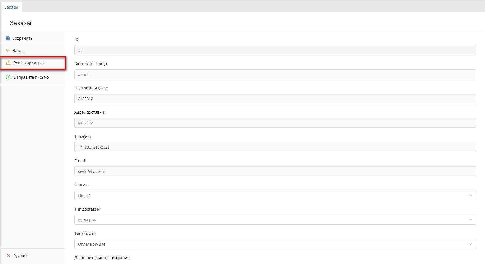 в результате откроется детальная страница заказа (скриншот), на которой можно редактировать данные клиента и заказа.