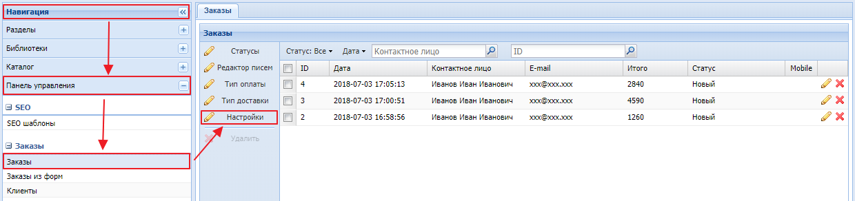 Типдоставки - при нажатии открывается интерфейс по редактированию типов доставки для формы "Оформления заказа". В 34 версии функционал перенесен в новый модуль "Оплата и доставка"