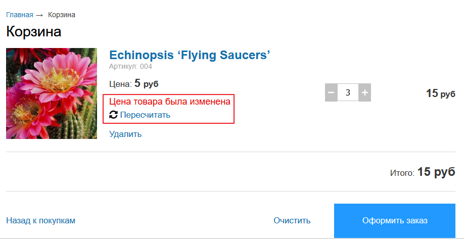 Если на сайте у товара выводится старая цена, но при этом она изменена в CMS (такое может быть в случае, если страница товара не обновлялась после изменения цены в CMS), то при добавлении товара в корзину его цена будет сразу же пересчитана.